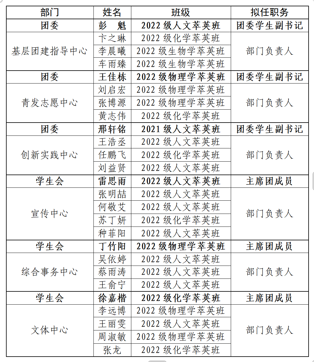 2024-2025学年萃英学院团学组织学生负责人名单 为促进萃英学院学生工作高质量、有序开展,更好发挥团学组织自我教育、自我管理、自我服务的积极作用,经自主申请、组织推荐、资格审查、公开竞选等程序,院团委、学生会2024-2025学年主要学生干部选拔结果如下,排名不分先后。