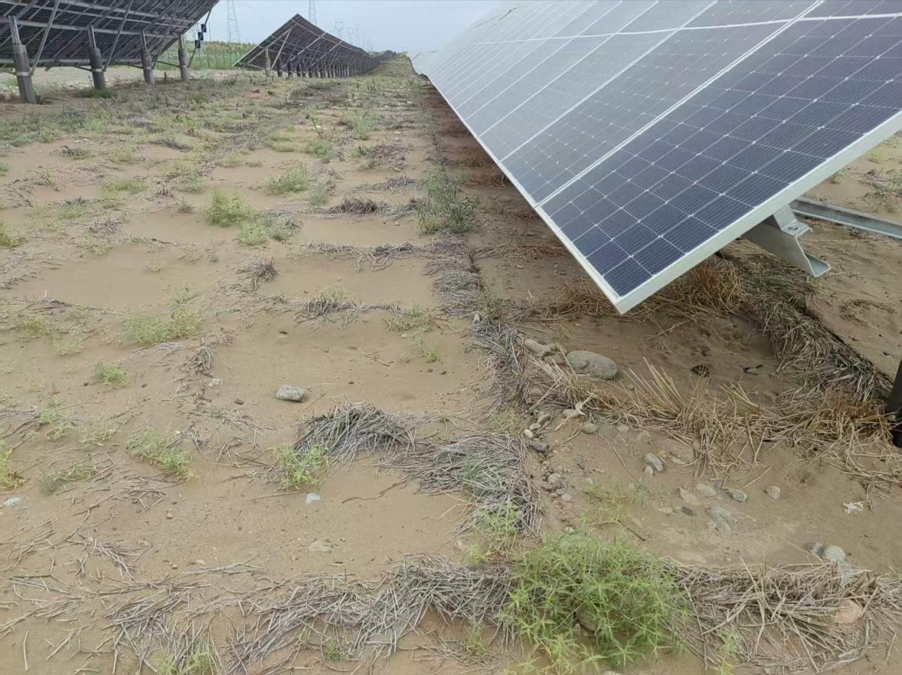 而在场区四周边缘,基地创新采用“草方格与植物固沙相结合”的方案,构建起多层生态防护网。从外围到光伏区,依次种植了梭梭、花棒等耐旱灌木,形成一条宽达40米的防风固沙林带。“为践行节水治沙理念,每株灌木栽植时仅灌溉1公斤定苗水,之后完全依靠自然降水生长。”负责人的介绍,让实践团成员对项目的生态可持续性有了更深认知。