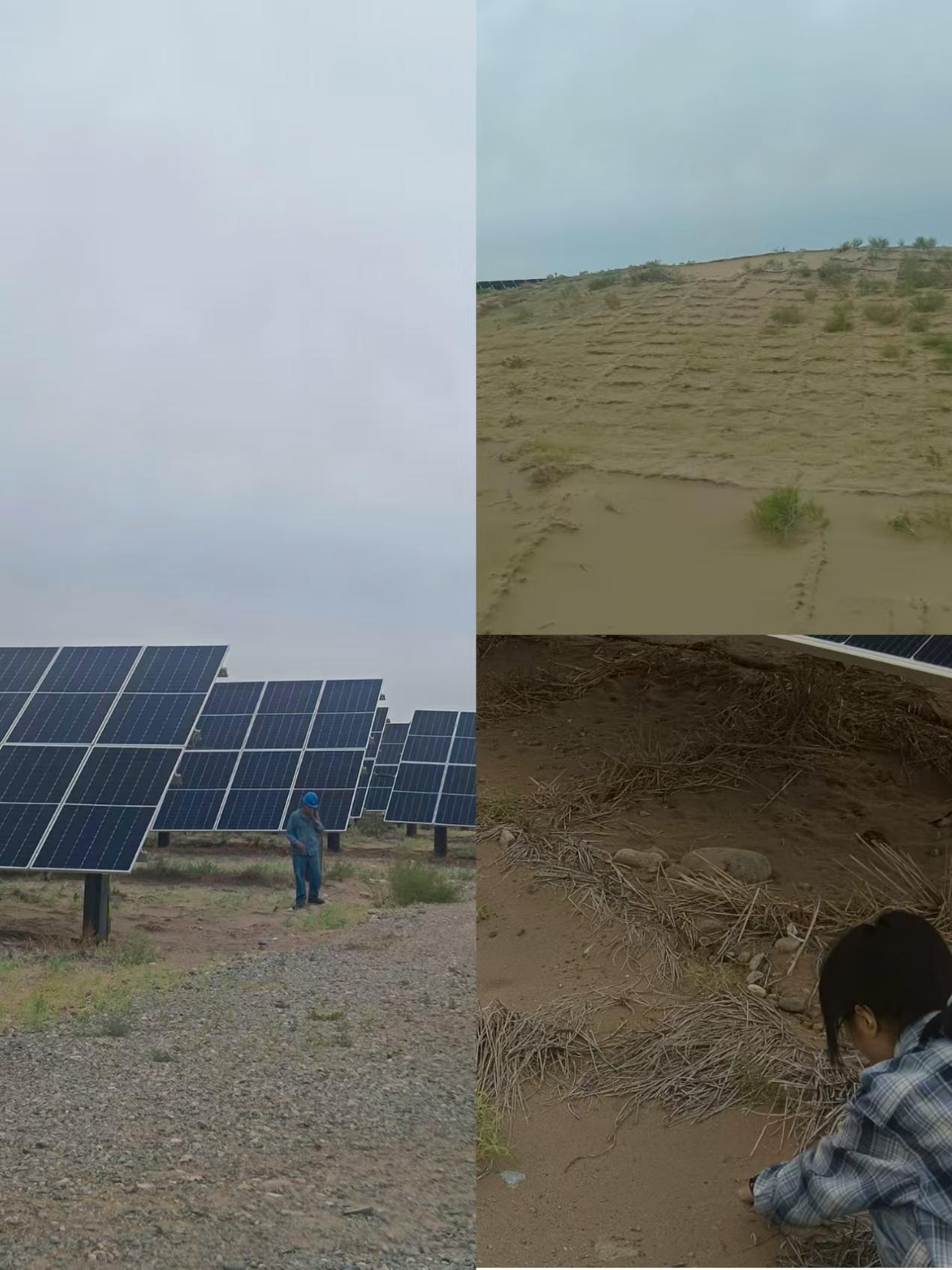 在调研过程中,实践团重点关注了基地的科学治沙措施,发现多项“组合拳”共同守护沙地生态。在光伏板之间,工作人员精心铺设了1.5m×1.5m的网格化稻草沙障,通过开沟、铺草、压沙等标准化工艺,将流沙牢牢固定,避免沙丘移动对光伏设施造成损害。这些草方格不仅能阻沙、降风,还能有效聚集雨水,为后续植被恢复储备水分。工作人员透露,为持续保持固沙效果,草方格沙障需每四年进行一次更新。